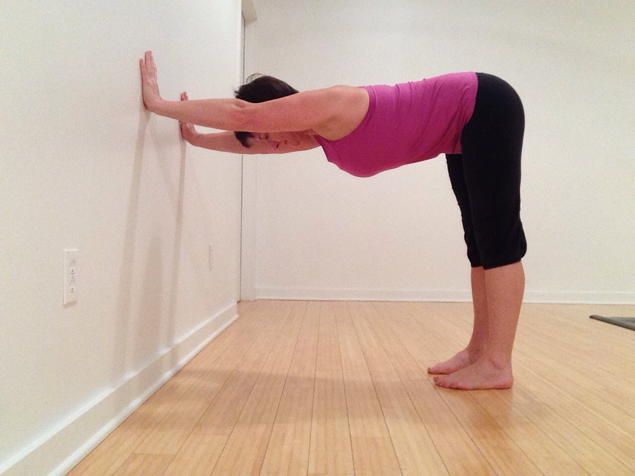 Option 1 – Down Dog at the Wall. This is a great variation if you have challenges inverting or with the strength of your wrists. Walk the hands down the wall to about hip height as you walk your feet away from the wall and find the body bent at a 90* angle. The angle can be reduced as needed. Find Hasta Bandha, spread the hands, press the knuckles, heels of the hands, and finger pads into the wall. Suction cup the middle of the palm away from the wall. If needed have a soft bend in the knees, then press the tail behind you. Lift the belly away from the floor and shrug the shoulders away from the ears.