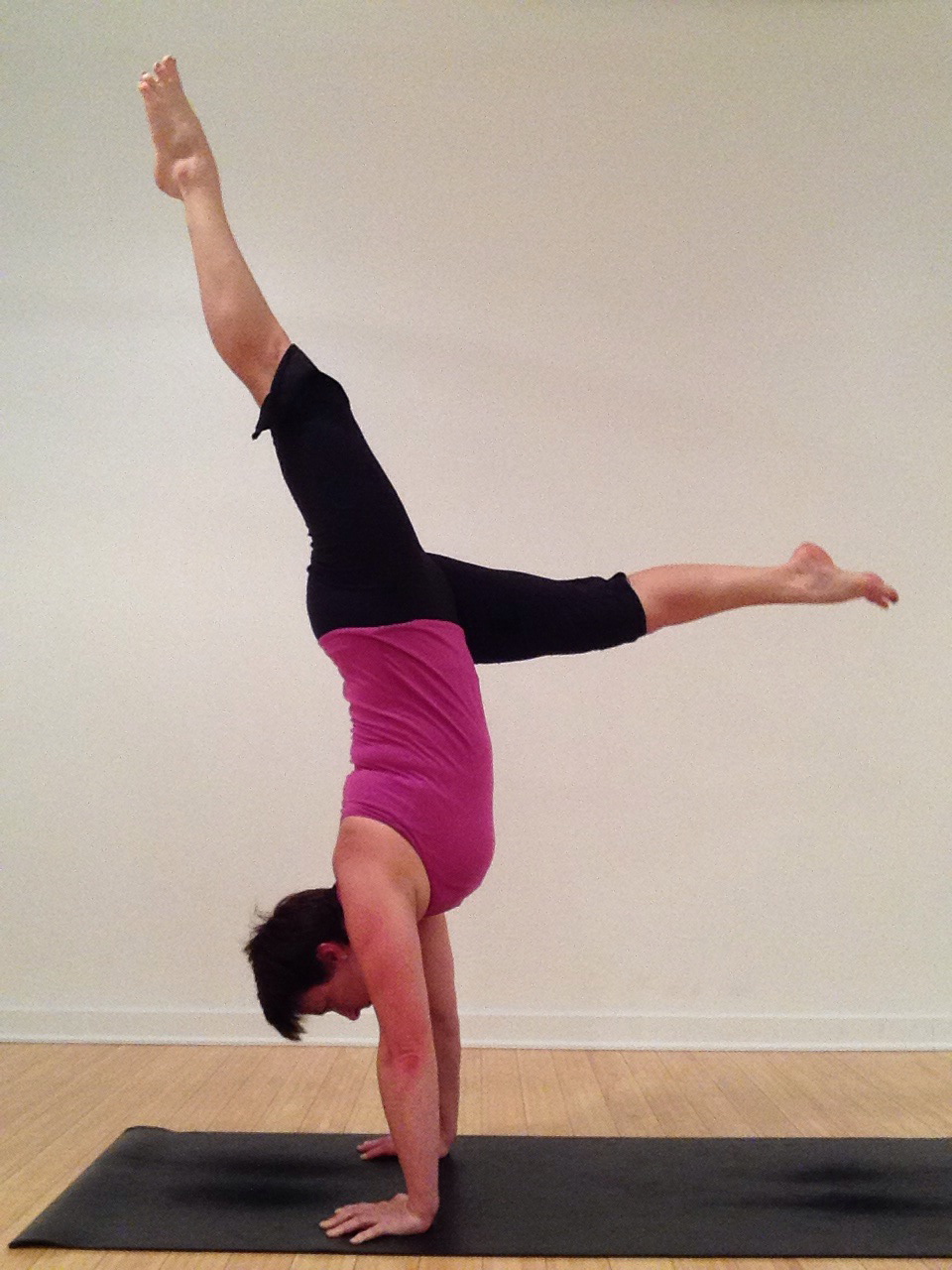 Option 3 – Handstand hop with legs in an “L” shape. From standing splits or a short 3-legged dog, take a controlled hop. Resist the temptation to bring the bottom foot together with the top foot. Hops can range from itty bitty to full, so work where you feel comfortable, but challenged. Keeping the bottom leg down does two things. First, it keeps the core and back engaged, second, you can bring the leg down at anytime.