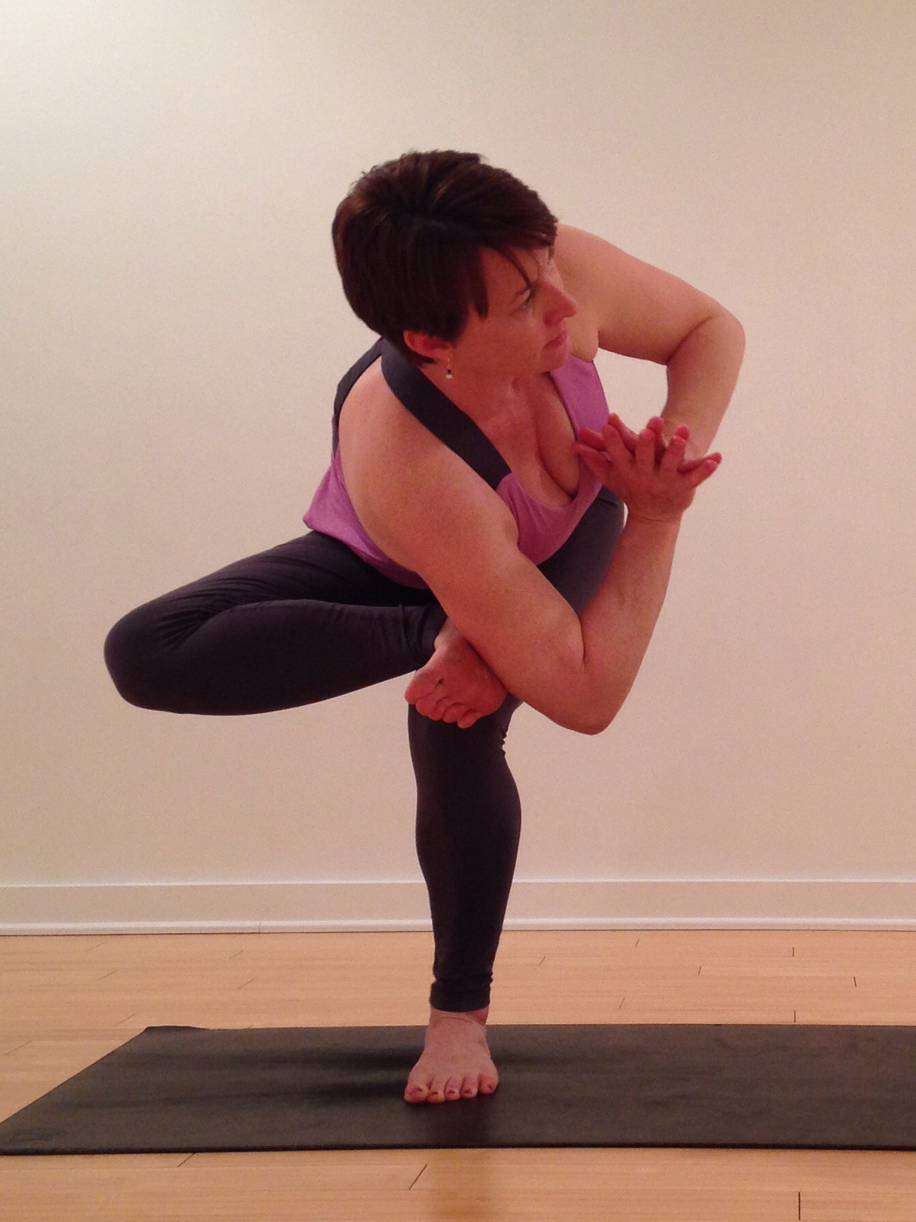 Option 1: Standing Pigeon Twist – From fierce pose with pigeon, twist in the direction of the top foot. Press the elbow into the arch of the foot, keeping the foot stable. Keep working the twist until you can get the triceps braced on the arch of the foot. If balance is an issue, work next to the wall for stability. You can also work on this twist from the seated pigeon variation. Be sure not to put on any lotion or balms as this makes it difficult to find secure placement of the foot.