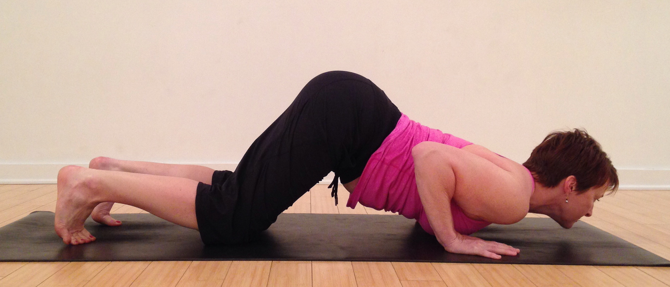 Option 2 – Chest on Block. Place a block between your hands. From all fours lower the chest to the block. Keep the tail lifted, creating an arch in the back. With the support of the block focus on the hug of the elbows and broadening of the collarbone and shoulders.