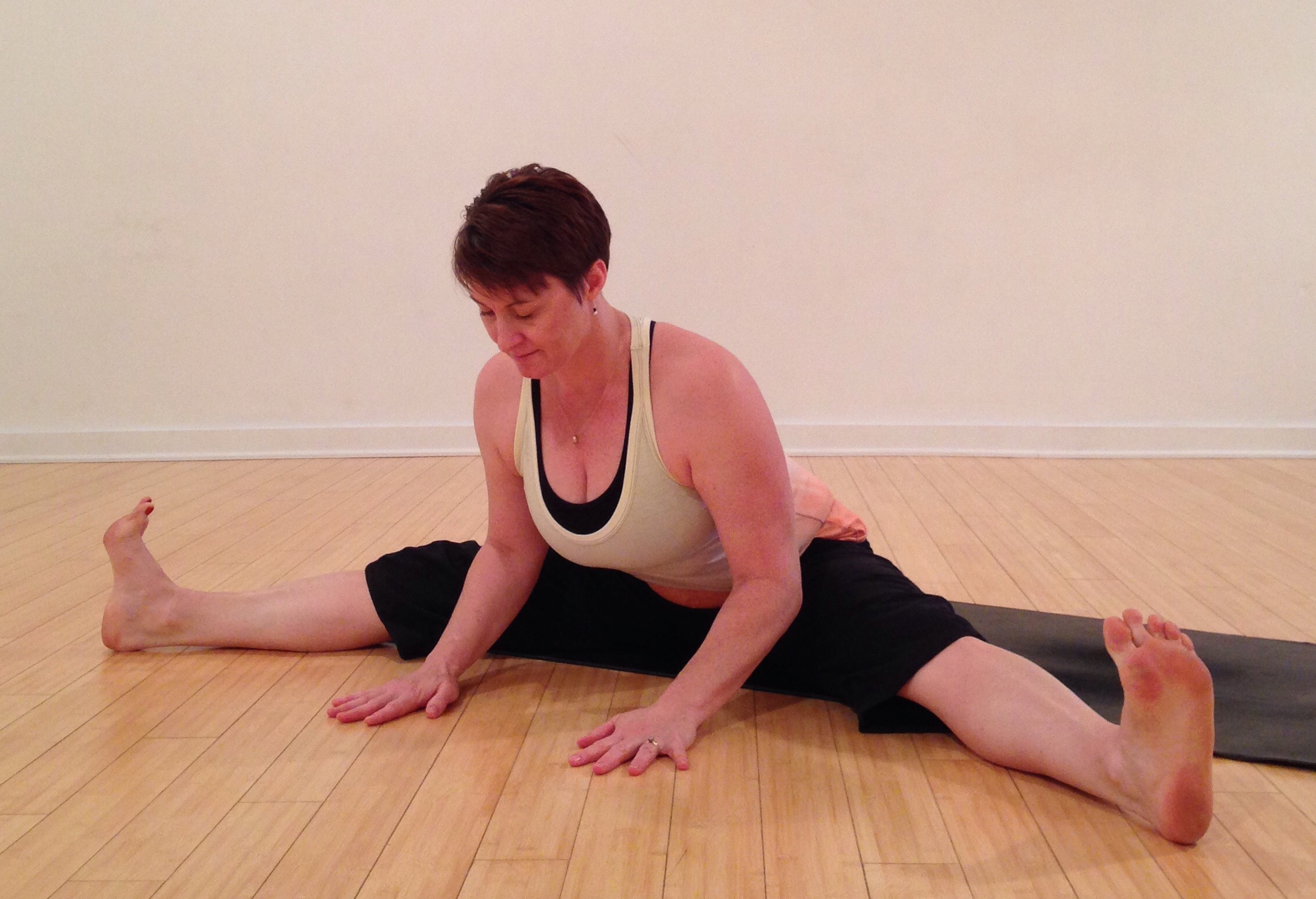 Option 1 – Seated Wide Leg Shift Forward. Take the legs wide with the feet flexed and toes pointing toward the ceiling. Sit up tall and, if needed, elevate the hips on a blanket, soften the knees, and/or bring the feet closer together. Begin by sitting with a long spine and hands resting on the thighs. When you can sit with legs long and feet flexed, shift the heart forward taking the hands to the floor or blocks. If the spine rounds or the sensation is too intense through the backs of the legs, you’ve gone too far. Adjust as needed. Then, take your focus to lifting through the pelvic floor.
