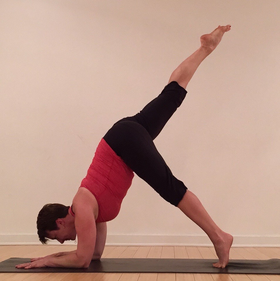 Option 4 – 3-Legged Dolphin. Keeping the pressure of the hands and forearms, and the shoulders away from the ears, lift one leg. Keep the hips level and notice the change in weight distribution in the arms and shoulders. Take several breaths. For more challenge, scoop the belly, lift the bottom heel and shift the shoulders forward. Repeat on the other side.