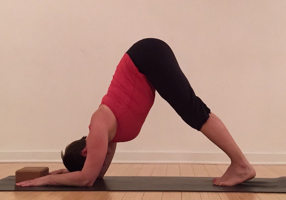 Option 2 – Hands Around a Block and Straight Legs. With the hands and elbows shoulder width, place a block between the hands. Press the “L” shape of the pointer finger and thumb around the block. Simultaneously, press the hands and forearms into the floor. As the hamstrings allow, straighten the legs, but do not sacrifice the height of the hips or the length of the back. Keep the heels heavy and reaching toward the floor.