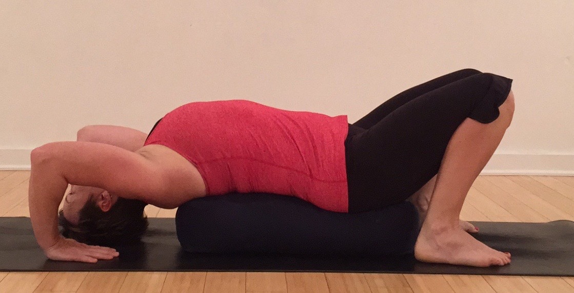 Option 1 – Bolster Support. One of the earliest hurdles to this pose is get the first few inches off the floor. With the arms in a rarely found position it can be difficult to tap into their strength. By elevating the torso on one or more bolsters, the first few inches is bypassed making the press up a little more accessible. Start with the back on a bolster or large pillow. With the hands at shoulder width or slightly wider point the fingers towards the shoulders. Shrug the shoulders onto the back. Place the feet at hip distance or slightly wider with the toes pointing forward in line with the knees. Press away from the bolster. Try to keep the alignment of the knees and legs with a gentle hug to the midline. Do the same with the arms and the elbows. Find a balance between hugging the knees and elbows in and the straightening of the legs and arms. Take a few breaths and then lower back to the bolster with control.