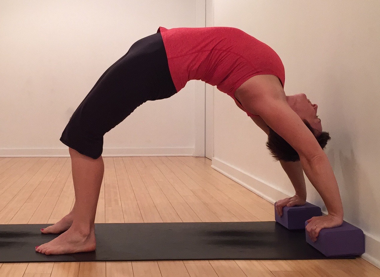 Option 2 – Block Support. Place two blocks against the wall about shoulder width apart leaving space for your head. Lie back with the head a few inches from the wall. Place hands on the blocks with the fingers over the edges. Place the feet hip distance with ankles stacked under knees. Press away from the floor, first coming to the crown of the head. Keep enough pressure in the hands and feet, so the head gently touches. Realign the elbows, shoulders, and knees then press up as much as you can. You may still have a bend in the knees or elbows. Be mindful to keep the back long, reaching the tailbone toward the heels, so you are not crunching the low back. Stay for a few breaths, lower to the crown of the head, then to the floor.