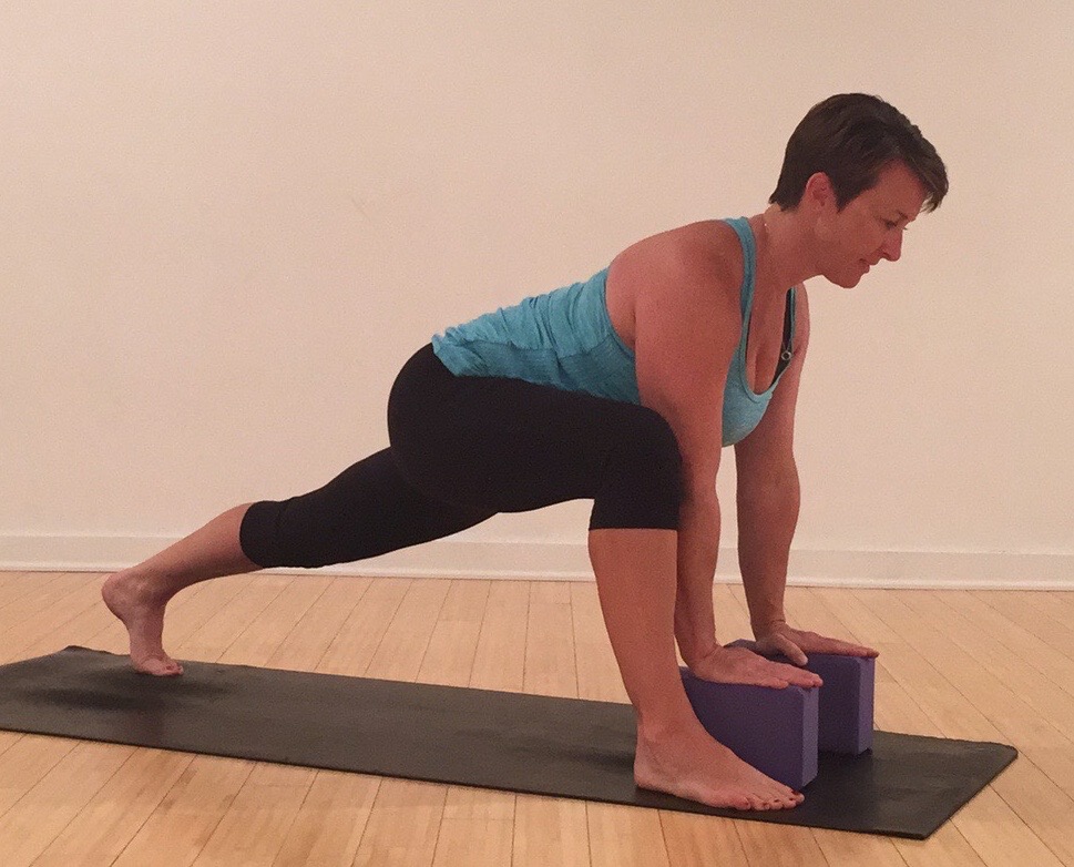 Option 1: Utthan Pristhāsana with blocks. From down dog, step the foot to the outside of the same hand. Keep the back heel lifted and the back leg long as if it were in plank. If there is any tension in the shoulders or neck, take the hands to blocks. Keep the hands shoulder width, with the arms long. Find a gentle pull of the hands toward the feet as you reach the shoulder heads wide. Keep the front foot pointing straight forward with the knee stacked over the ankle, pointing in the direction of the toes. Gently lift through the pelvic floor as you tone the belly.