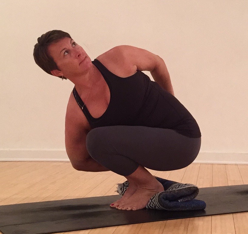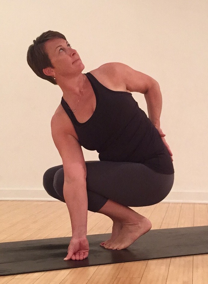 Option 1: Toe Squat with a Twist. With the feet together, squat down bringing the tail toward the heels. Keep the heels as heavy as possible. Someday they will ground to the floor. Hug the feet and knees together as you find balance. With a long spine, twist, taking the opposite elbow to the thigh. Use the elbow to press the legs away. Press the top hand down to deepen the twist. Work to center the thumbs to the sternum, and to broaden the collarbones. Breath fully into the constriction of the twist.