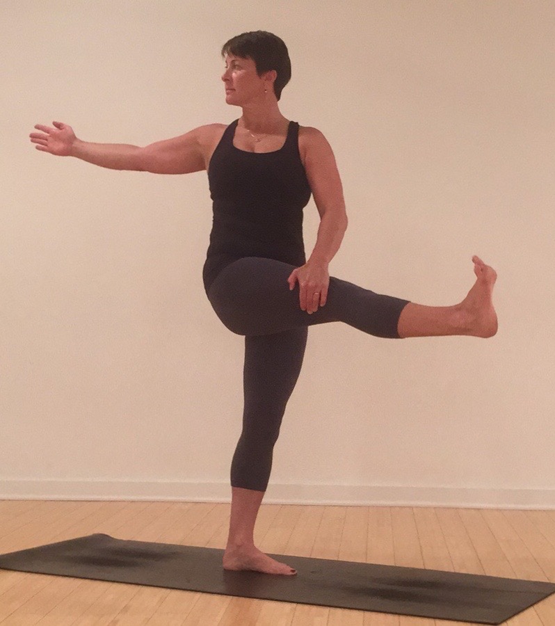 To practice this week’s PowerPose, Parivṛtta Hasta Pādānguṣṭhāsana or Revolved Hand to Big Toe Pose, it might be helpful to prioritize. A long spine, as found in Tādāsana or Mountain Pose is high on the priority list. Creating space and length through the spine makes the revolving action much more accessible and safe. While it may seem to define the pose, the extension of the lifted leg is actually a low priority. If we put too much energy and focus in the extension of the top leg, important elements like, balance, length of the spine, and revolving get lost in instability and chaos.