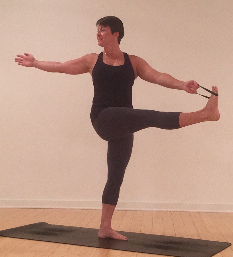 Option 3 – With a Strap. Place a strap or binding ring around the ball of the extended foot. Imagine you could extend the leg keeping the foot in line with the hip. Find a balance between the extension of the leg and lift of the foot. Use the strap to bridge the gap between the hand the foot. Keep the length of the standing leg and the spine as you pull on the strap to find a deeper revolution of the spine. There are two future options for hand placement, grabbing the big toe or reaching for the pinky edge of the foot. When you use the strap, allow the hand to find one of the positions, so you begin to build muscle memory and proper alignment for the peak expression of the pose. Work with the thumb up (big toe grab) or down (pinky edge grab), keeping the shoulder engaged on the back.