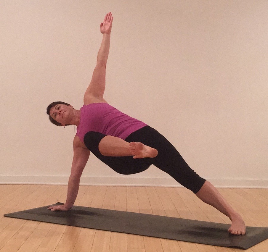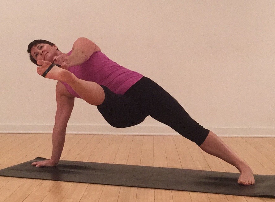 This Side Plank Variation where the top leg is grounded is a great check on whether or not the whole body is involved in the pose. The grounding through the top foot is an additional challenge and a bit of an awkward configuration that almost forces the torso to participate. Without the support of the bottom leg, the whole body must be engaged and active if there is any hope to find stillness and peace in the pose.