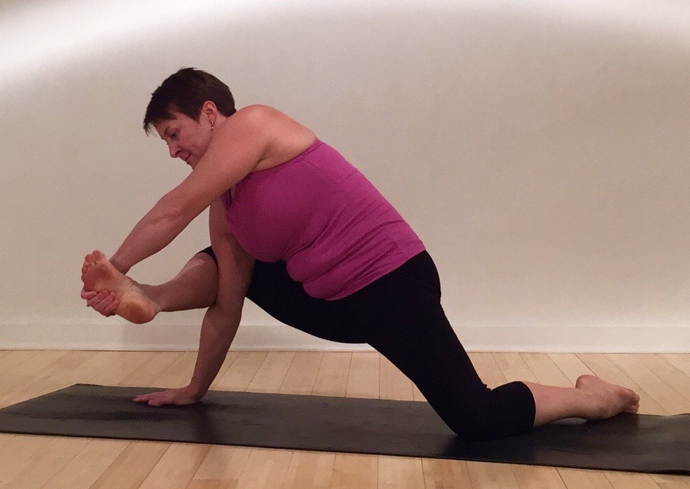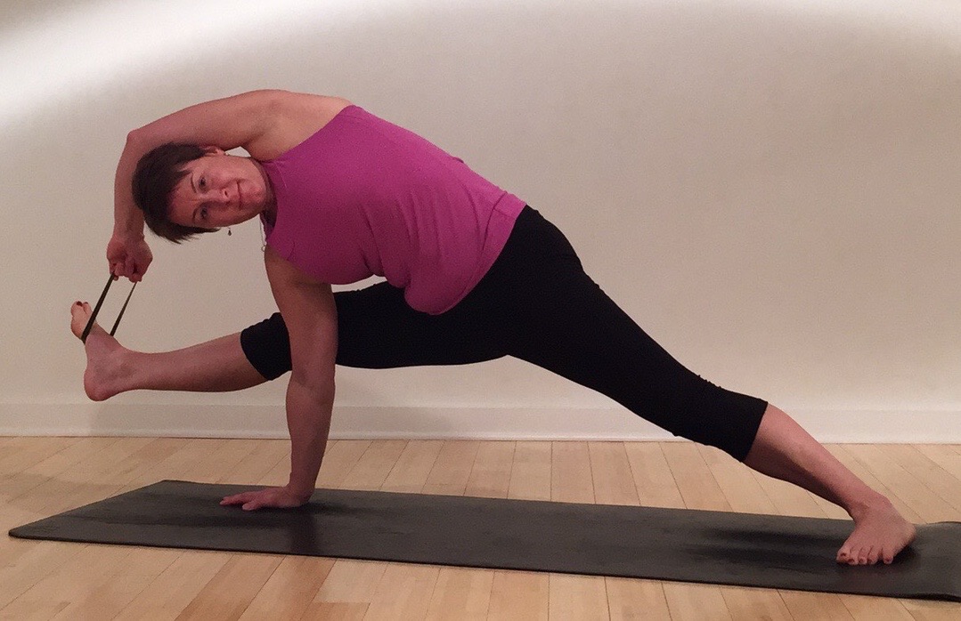 Option 3 – Plant the Back Foot: When you feel you can explore this pose while keeping the bottom shoulder stable and safe, build to plant the back foot. From a fingertip lunge, plant the back foot like a Warrior II foot. With only one foot for balance, it’s important that you use the full footprint for stability. Press through the blade edge of the foot while keeping the arch edge rooted. The toes will gently grip the mat. Image you can suction the foot to the floor through the arch. Begin to snuggle the shoulder under the knee just like you did in the kneeling variation. Work in stages to pick up the foot and begin to find extension. Work slowly and mindfully, so you do not strain the bottom shoulder or hamstring. If needed, us a short strap or binding ring to reach the foot.